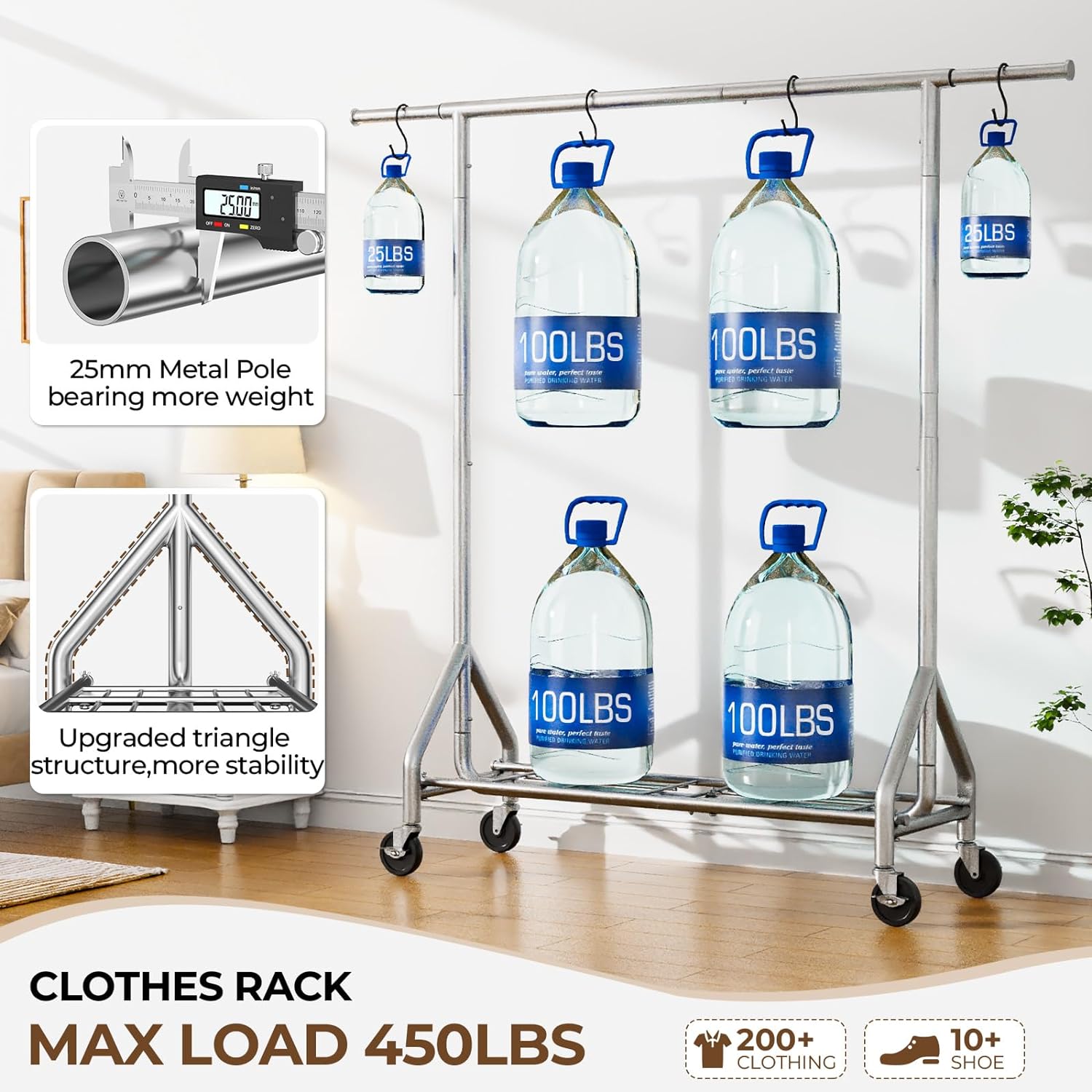 Heavy Duty Clothes Rack Load 450 LBS, Metal Garment Rack, Standing Rolling Clothing Rack for Hanging Clothes with Sturdy Wheels & Shelves, Portable Closet Wardrobe Rack,Sliver