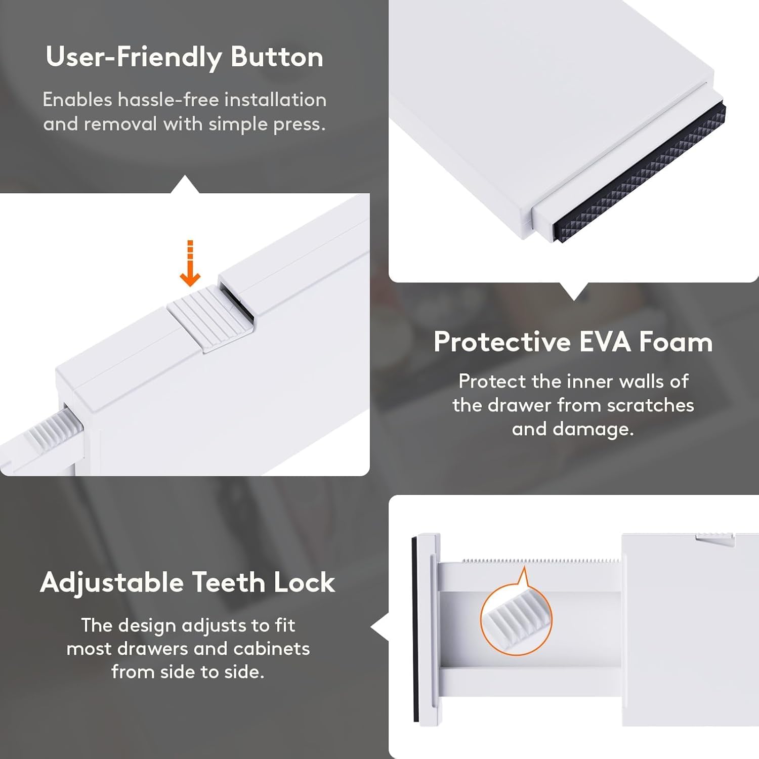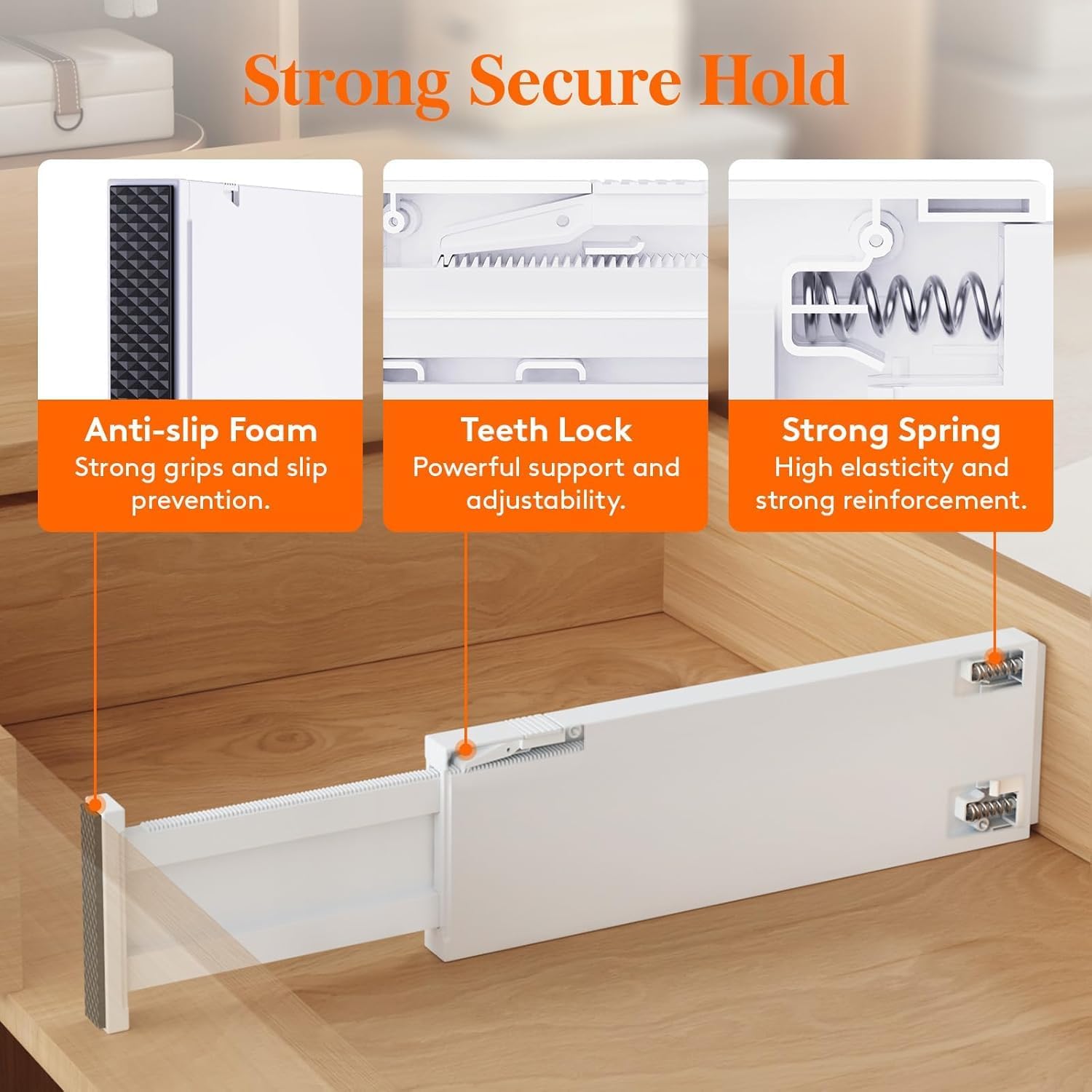 Teeth lock design and strong spring tension secure drawer dividers upright.