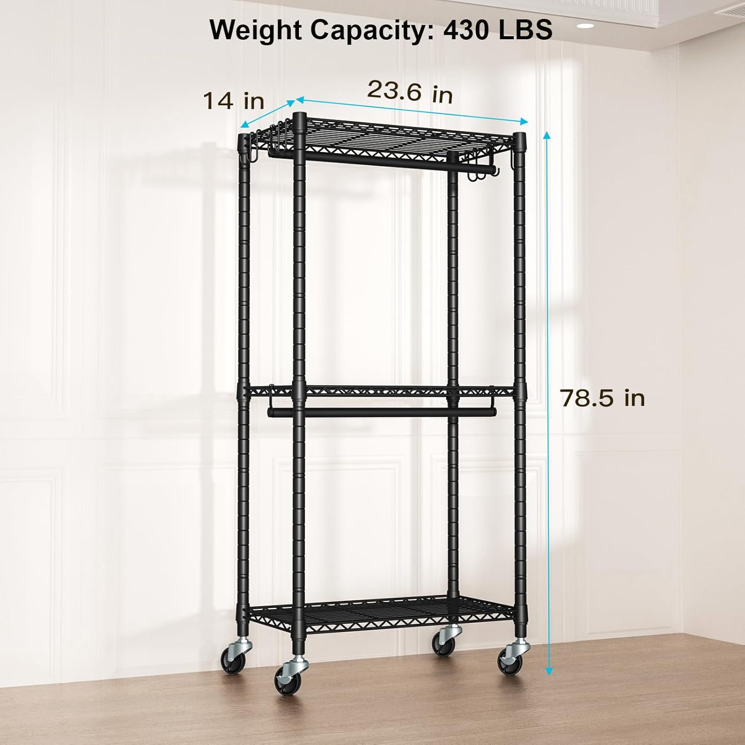 P3 Mini Rolling Clothes Rack, Clothing Racks for Hanging Clothes, Heavy Duty Garment Rack with Wheels, Freestanding Portable Closet Rack 23.6'' W x 14'' D x 78.5'' H, Max Load 430 Lbs, Black