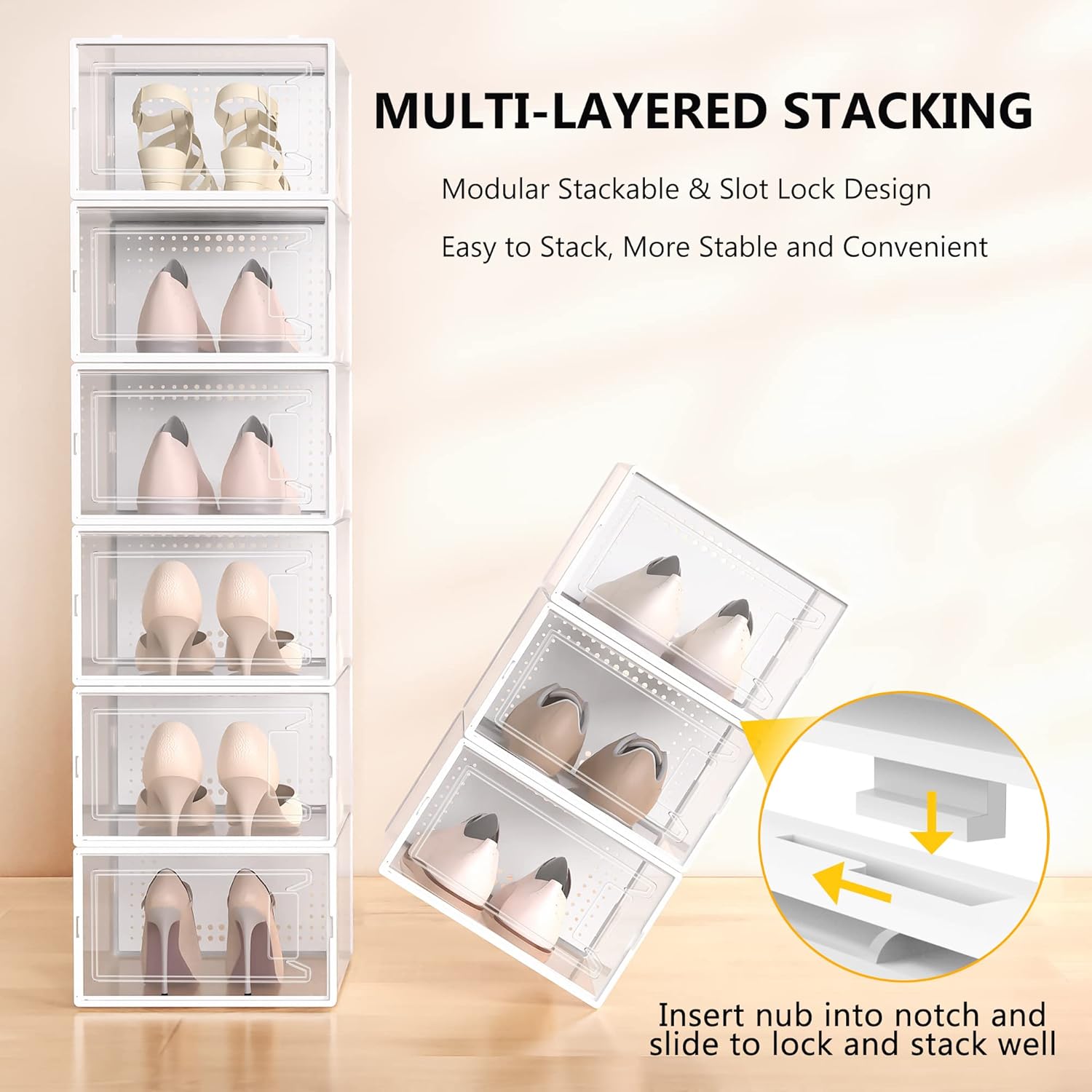 Secret Space 12 Pack X Large Shoe Organizer Storage Boxes for Closet, Modular Space Saving Shoe Boxes Clear Plastic Stackable Sneaker Containers Display Case with Lids, White