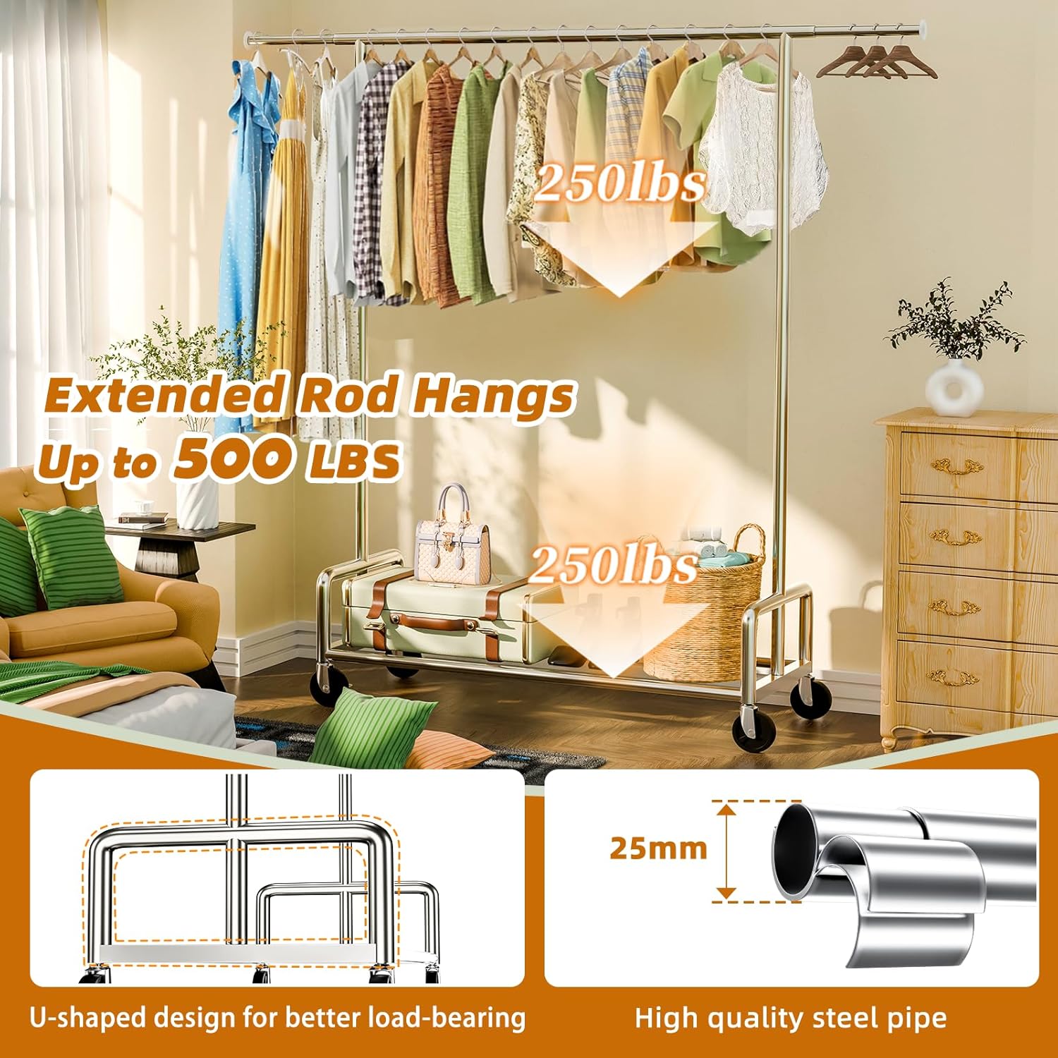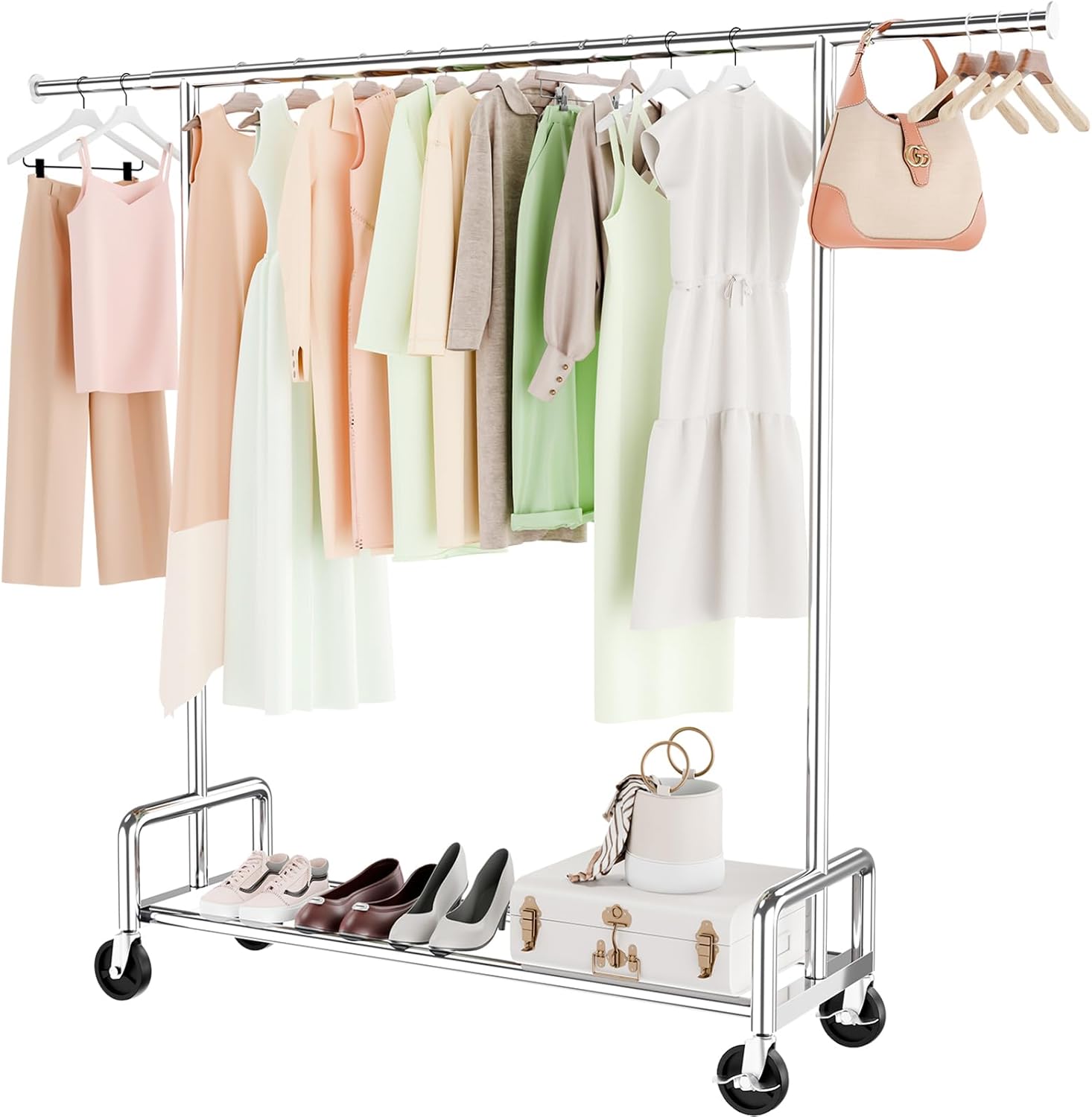 Simple Trending Heavy Duty Clothing Clothes Rack with Wheels for Hanging, Metal Rolling Garment Rack Organizer Load 500 LBS, Chrome
